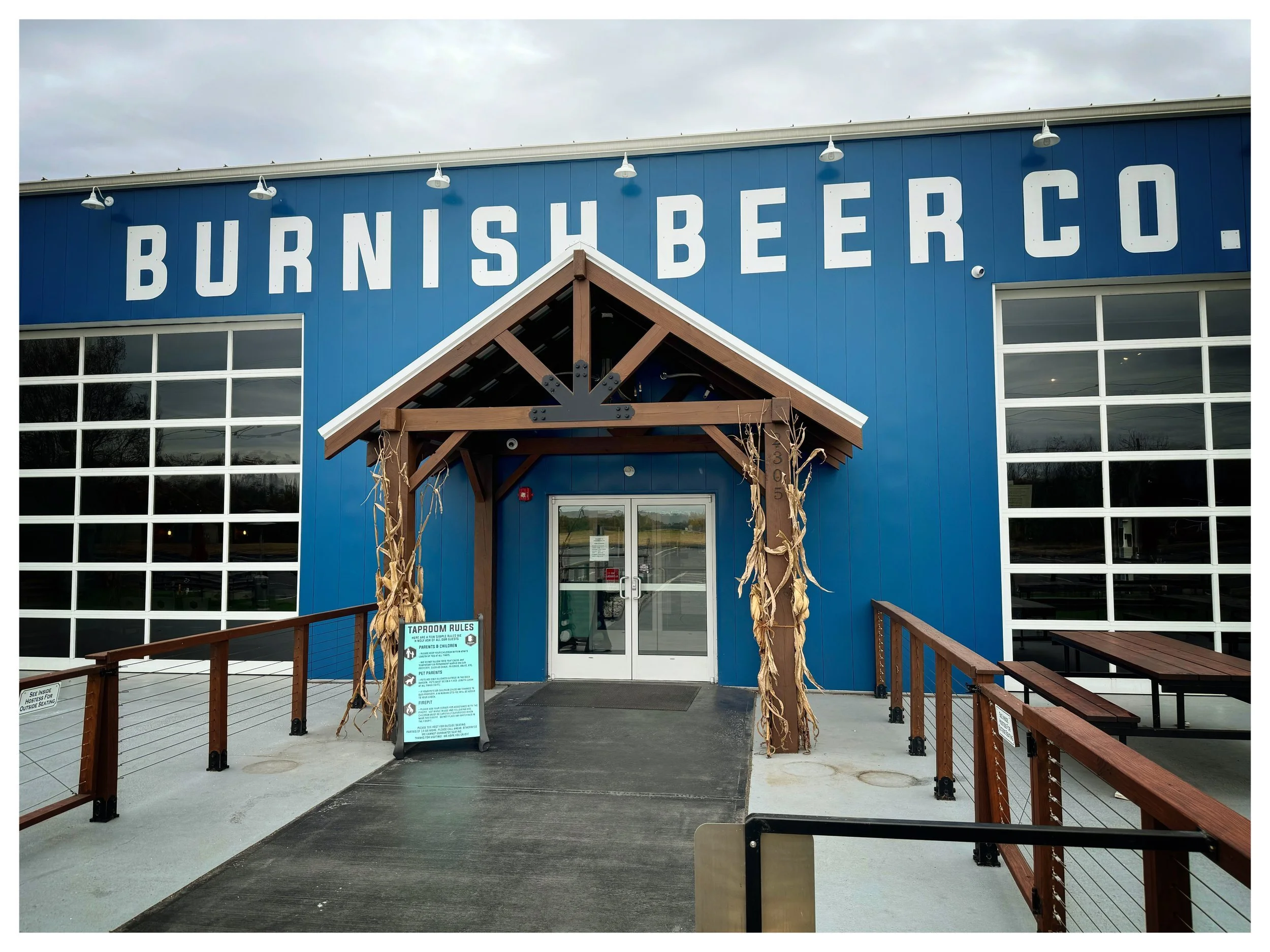 In May 2020, beginning with what was a rusted and abandoned boat factory, the Burnish team made smooth and bright, and from that optimism and foresight came the name for their brewery. Randy’s wife Brenna enjoys photography and tells how one day she was taking photos of the building that would become the brewery. They were still struggling for a name at that time. Rust was foremost in the building and so she went to the thesaurus to she how she could play off that. The opposite of rust is burnish — or maybe better thought of as a refinement — was revealed in her research and she suggested that as a possible name for the brewery. And thus Burnish was adopted. Perhaps as a reminder from where they have came, the rusted metal behind the bar that greets you as you enter the taproom was repurposed from Randy’s father-in-laws old chicken houses. It was allowed to rust a bit more and sealed and now sits behind the polished Burnish lettering. An aesthetic touch with a lot of meaning.