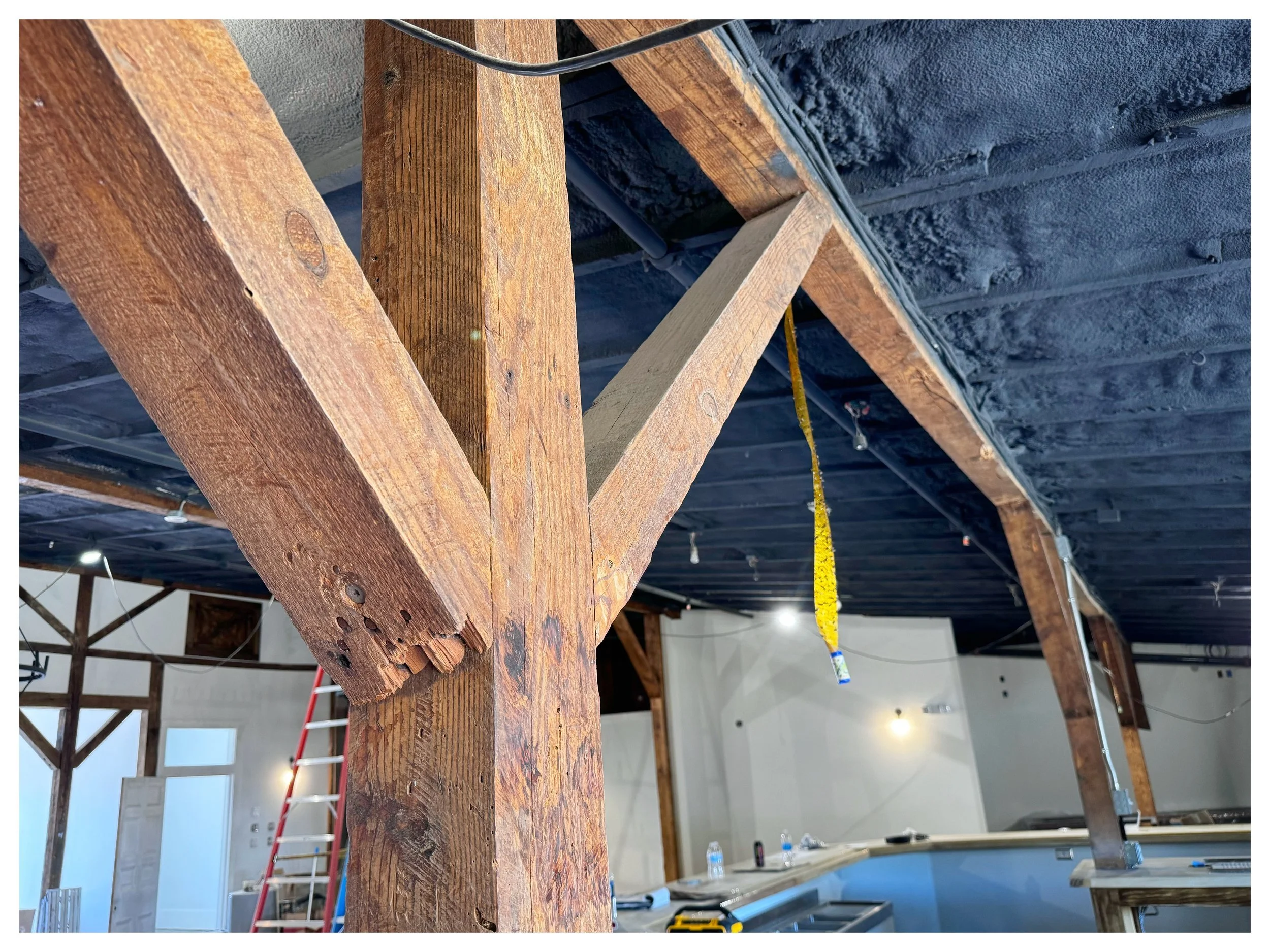 According to Adam’s research, the building housing the brewery was built in the 1930’s, serving as a distribution center and loading docks for produce. You can see much of the character of that purpose that has been purposefully carried forward the the taproom. The old wooden sliding door, the wooden post and beams, the iconic tower on the roof used in the logo. The property was purchased in October 2022 and construction began some months later.