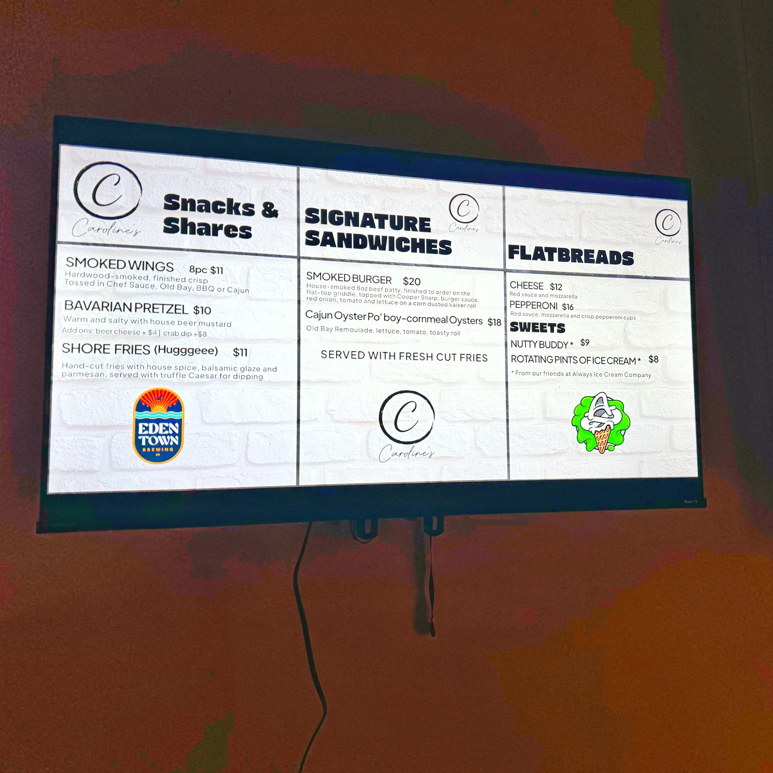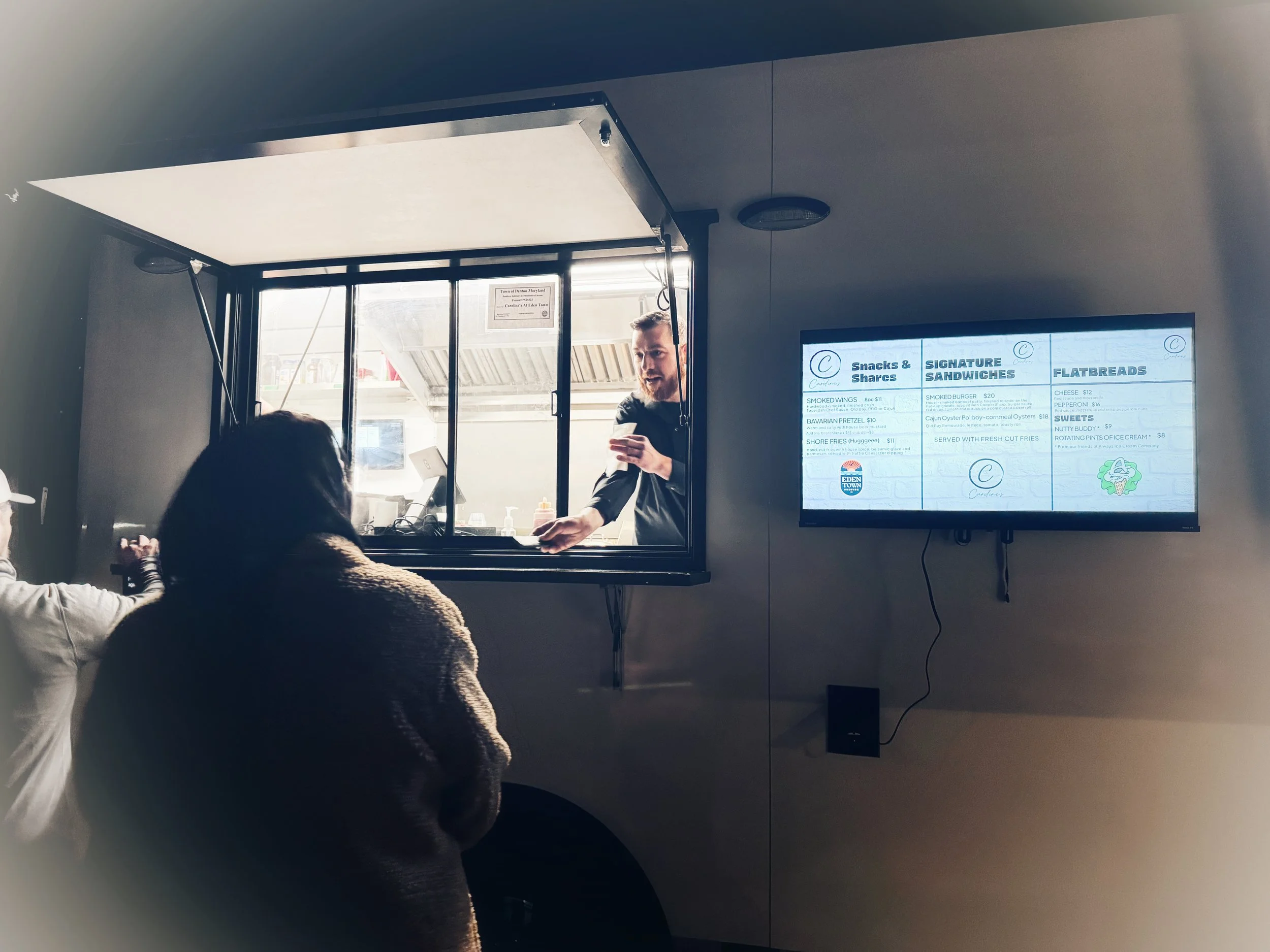 Caroline's provides a diverse and appealing menu designed to complement the beers. Offerings include a half-pound smoked burger, signature truffle fries, smoked wings with a choice of chef's sauce or Old Bay, a Cajun oyster po'boy, and a massive Bavarian-style pretzel served with house mustard and optional crab dip or beer cheese, and flatbread pizzas. Matt and Sarah are committed to using compostable materials for all their food service items, aligning with an environmentally conscious approach. This partnership ensures that guests can enjoy a full culinary experience alongside their beer, enhancing their visit and encouraging longer stays.