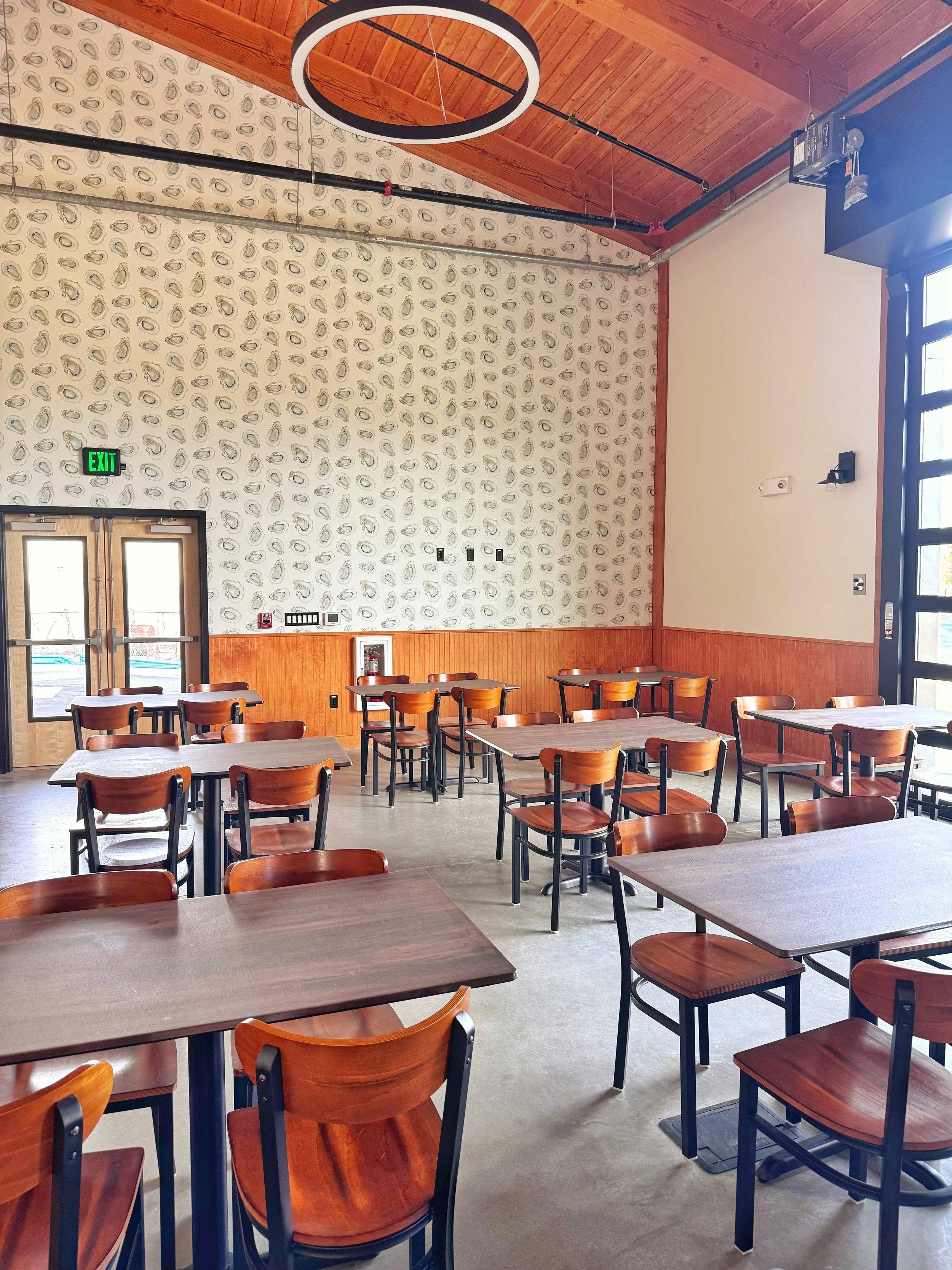 The lofty Eden Town taproom with pergola, sail, and contemporary lighting