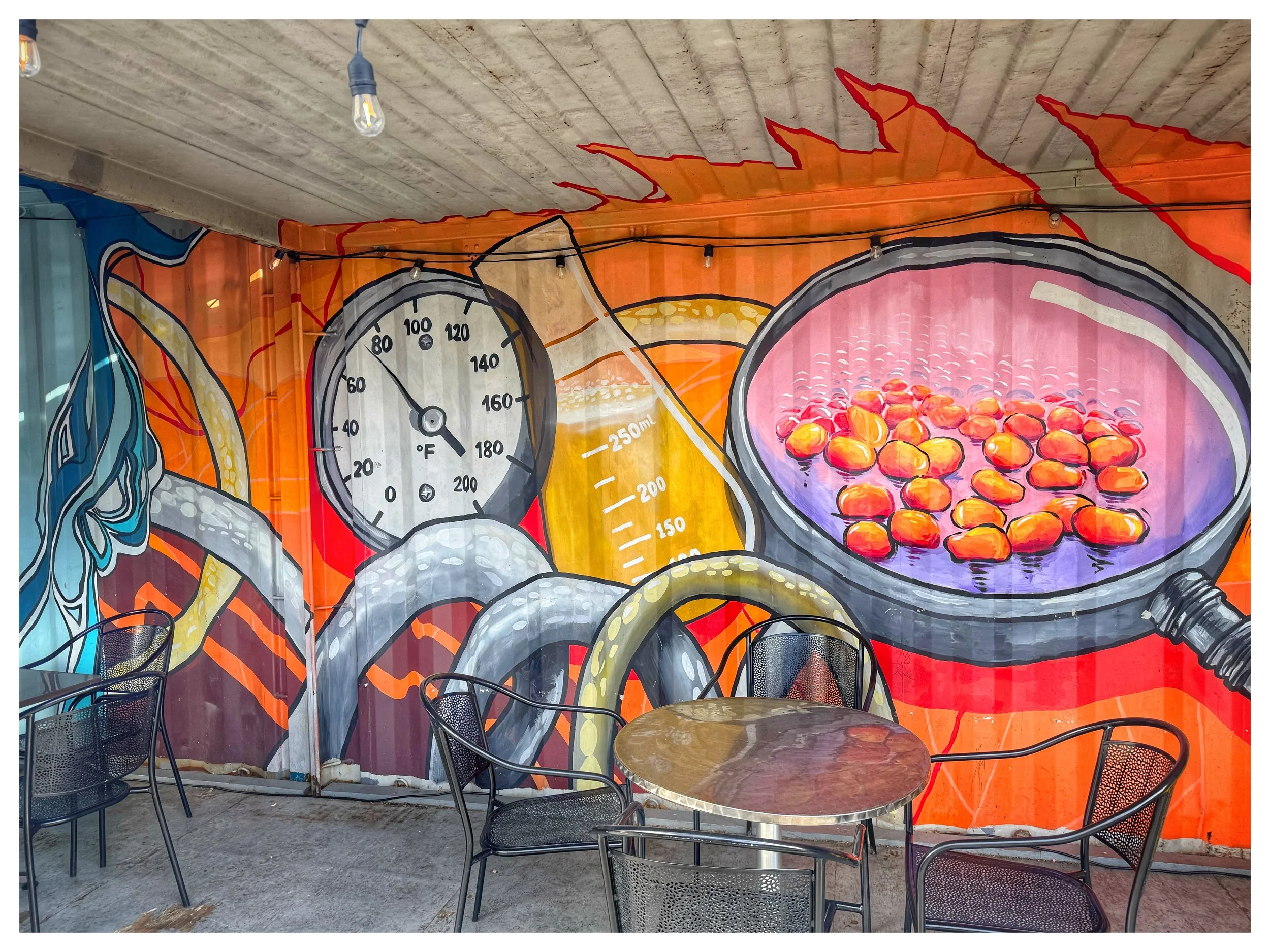 Biergarten murals of brewing elements add color and visuals